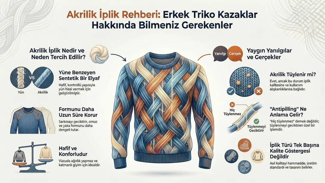 Bu yazıda akrilik ipliği abartmadan, kötülemeden ve net şekilde ele alıyoruz. Bu yazı, akrilik ipliğin ne olduğunu anlatmak kadar, erkek triko kazak seçerken bu bilginin sana ne kazandıracağını da netleştirmek için hazırlandı.