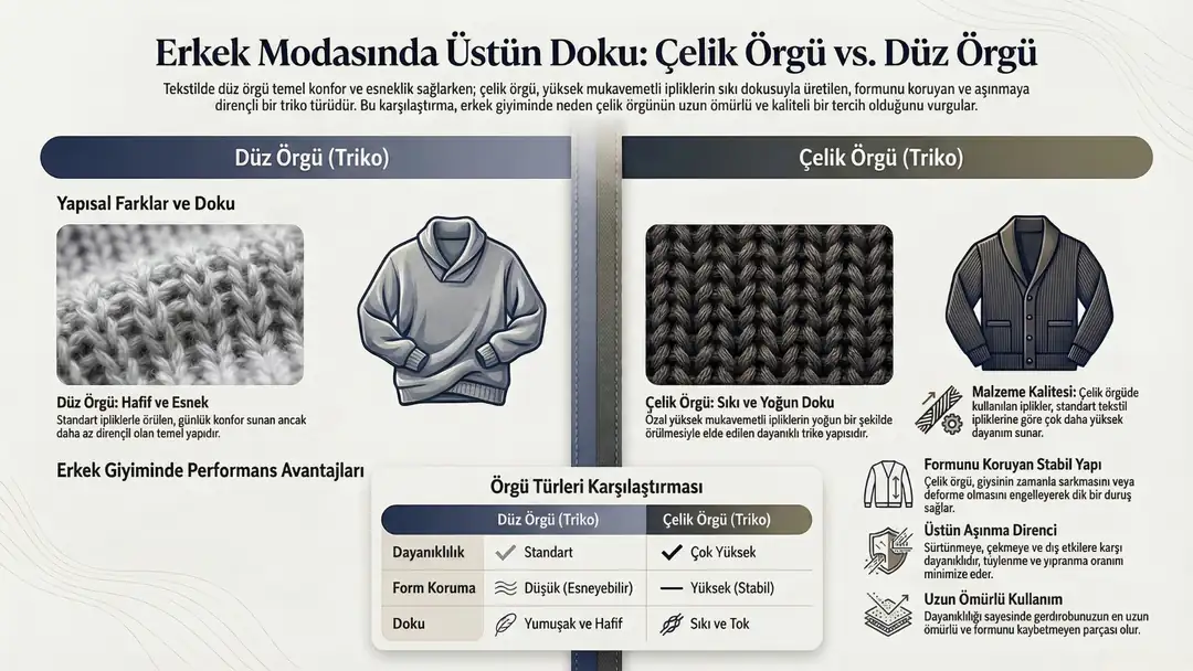 Düz örgü, günlük ve konfor odaklı ürünlerde tercih edilirken; çelik örgü daha çok teknik ve dayanıklılık gerektiren uygulamalarda kullanılır.