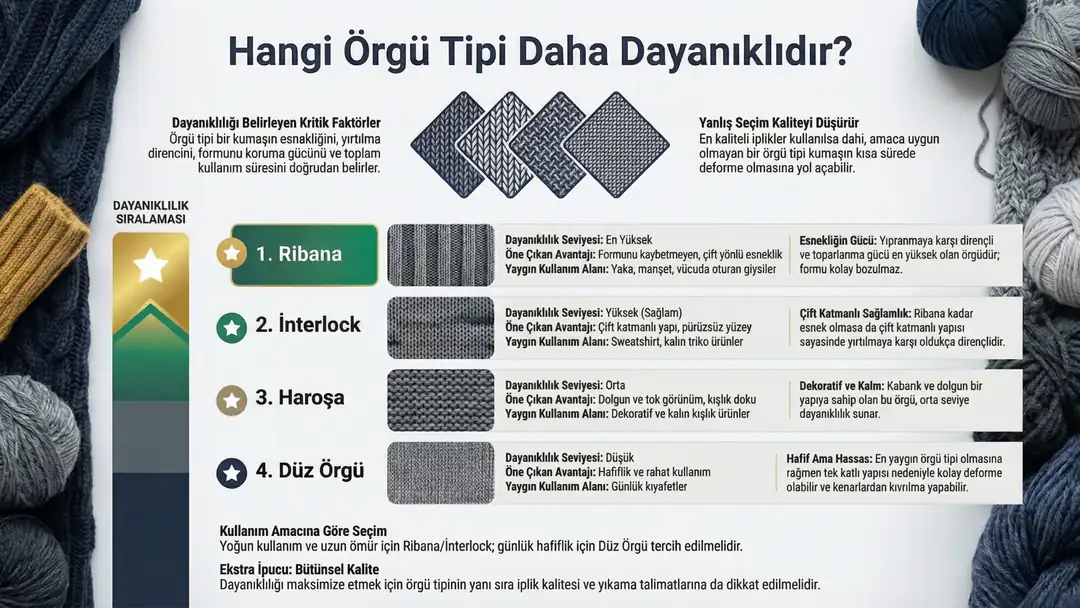Eğer uzun ömürlü ve formunu koruyan bir ürün istiyorsan, ribana ve interlock örgü tercih etmek en doğru seçim olur. Ancak kullanım amacına göre örgü tipi değişebilir. Günlük rahatlık için düz örgü yeterliyken, yoğun kullanım ve dayanıklılık için daha güçlü örgüler tercih edilmelidir.