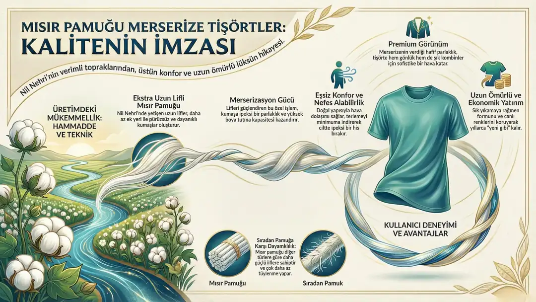Dünyanın en kaliteli pamuk türü olarak kabul edilen Mısır pamuğu, merserize işlemiyle birleştiğinde ortaya gerçekten fark yaratan bir ürün çıkıyor. Bu yazıda Mısır pamuğu merserize tişörtlerin neden bu kadar özel olduğunu, hangi avantajları sunduğunu ve neden tercih edilmesi gerektiğini detaylı şekilde ele alıyoruz.