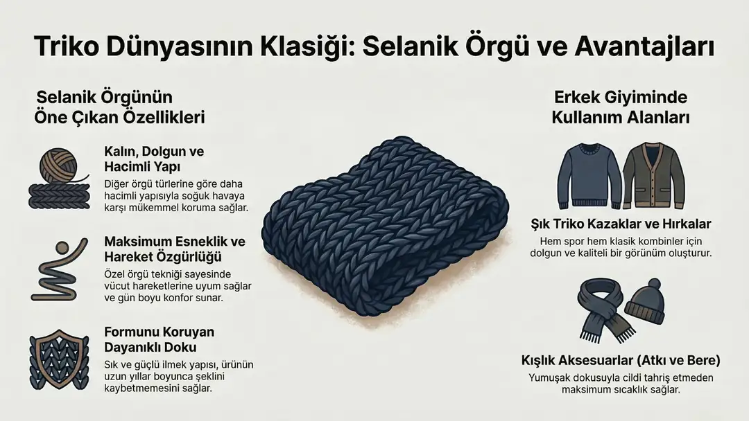 Selanik örgü, kalın, esnek ve dayanıklı yapısıyla modern giyim üretiminde önemli bir yere sahiptir. Konforlu yapısı ve kaliteli görünümü sayesinde özellikle triko ürünlerde sıkça tercih edilen bir örgü türüdür.