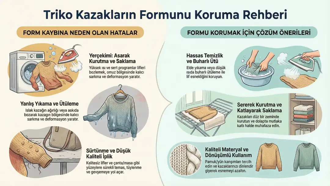 Triko kazaklarda form kaybı çoğunlukla yanlış kullanım ve bakım alışkanlıklarından kaynaklanır. Ancak doğru yıkama, kurutma ve saklama yöntemleriyle bu süreci büyük ölçüde önlemek mümkündür. Küçük ama etkili bakım adımları sayesinde kazaklarınızı uzun yıllar boyunca ilk günkü formunda ve şıklığında kullanabilirsiniz.